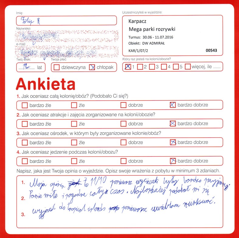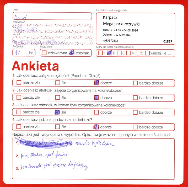 “Poznalem wielu fajnych ludzi. Było super w Heide Parku. Byłem na Śnieżce!!!”