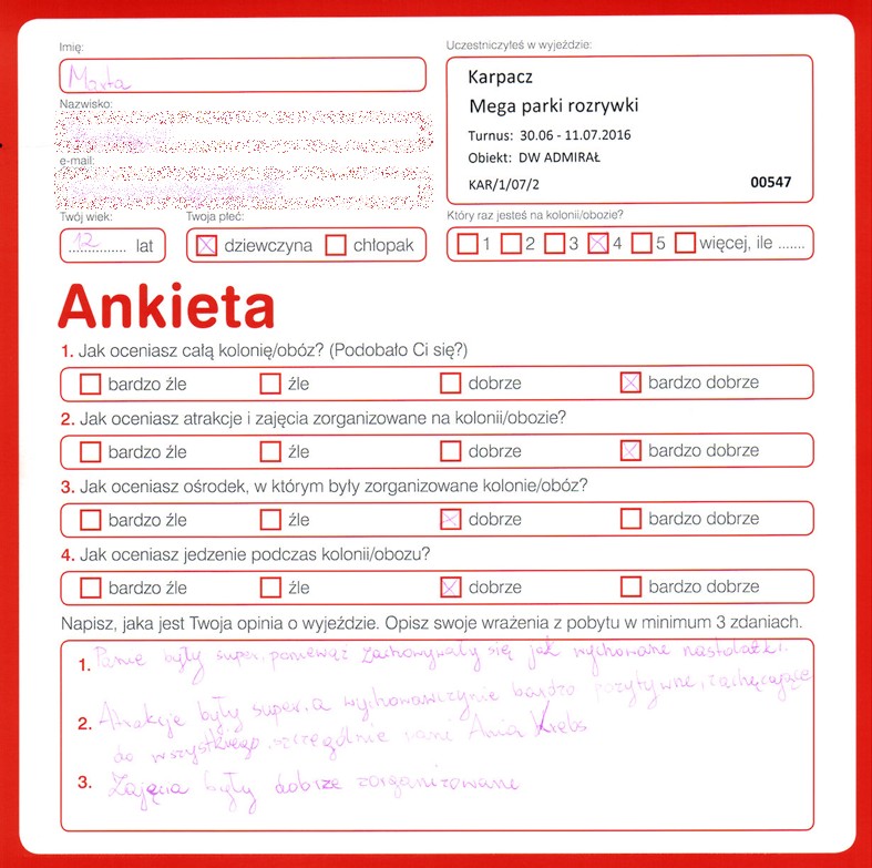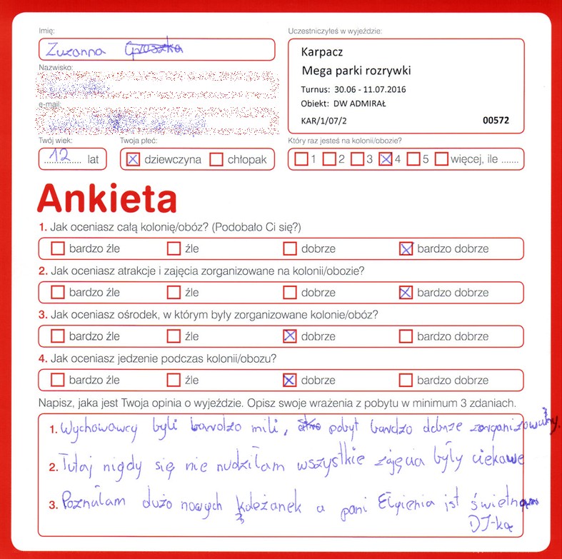 “Świetna kolonia! Plan zajęć idealnie dostosowany do potrzeb uczestnika, Świetna, uprzejma kadra i wychowawczynie. Wygodny autobus i bardzo fajni kierowcy.”