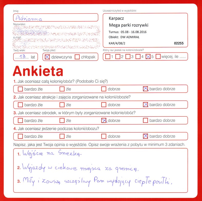 “Interesujące było zwiedzanie Karpacza. Bardzo miły wychowawca. Dobre towarzystwo kolonijne.”