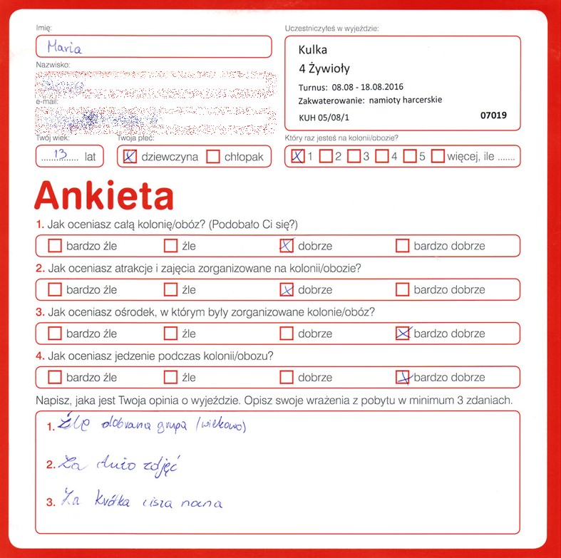 “Nasza panie jest super super super fajna. Ceny w sklepiku są zawyżone. Instruktorzy są bardzo fajni. Jako obóz 4 żywioły mieliśmy za mało zajęć w powietrzu. Hałas za oknem w pawilonie 3 z samego rana uniemożliwiał mi spanie”
