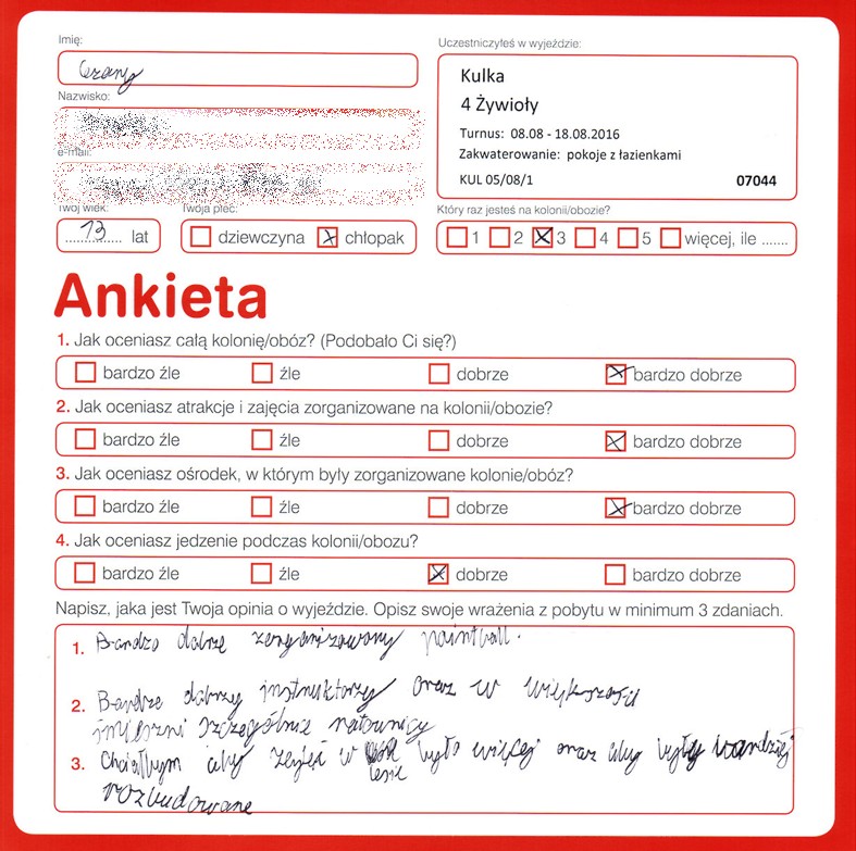 “Uważam że najlepszy instruktor to pan Ariel. Pokoje mogłyby być mniej śmierdzące:) Organizacja zajęć była profesjonalna. Pani Ania Tarasewicz jest najlepszą wychowawczynią w Kulce”