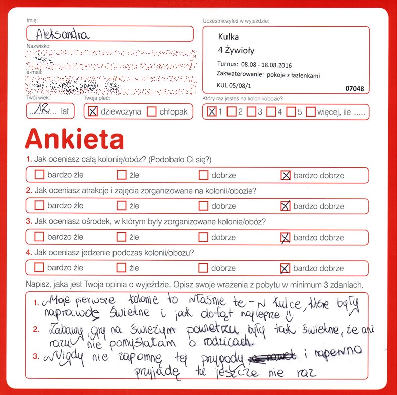 “Na koloni bardzo mi się podobało, Pani była bardzo miła i wogule na nas nie krzyczała. Atrakcje były zachwycające. Bardzo dobrze się bawiłam i najchętniej wróciłabym tu za rok. Jedyne co mi się nie podobało to przeciekające prysznic z którego bez przerwy po kąpieli lała się woda, przez niego cały pokój był zabłocony i mokry”