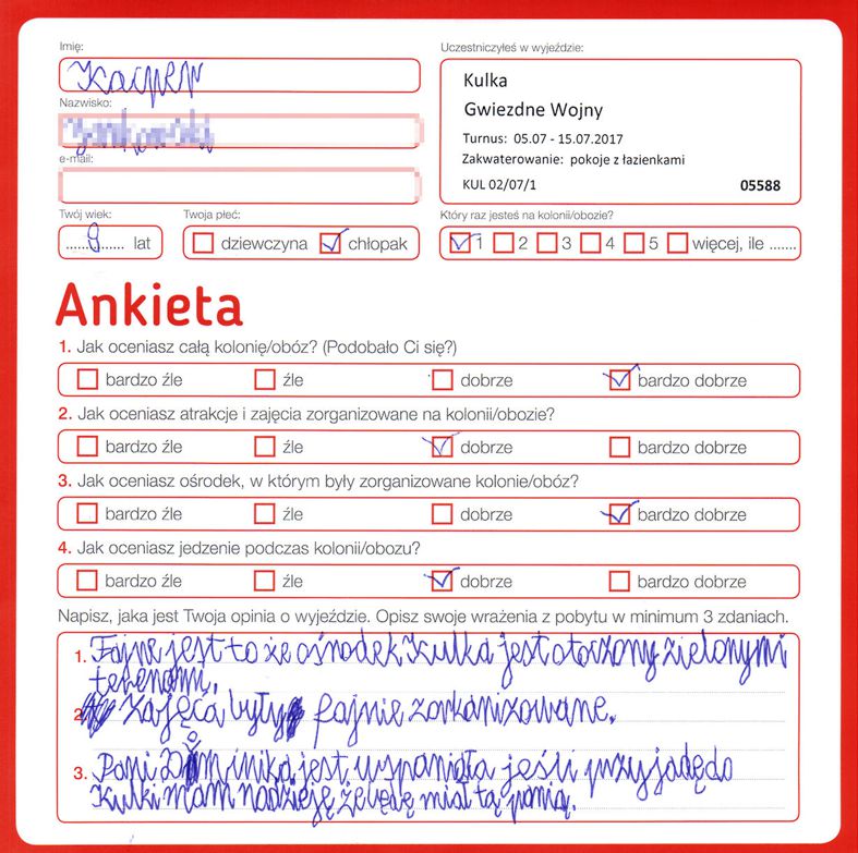 “Obóz/kolonia bardzo mi się podobał i możliwe że za rok pojadę. Miałam według mnie najlepszą wychowawczynie. Jedznie było bardzo dobre i smaczne strasznie mi smakowało”