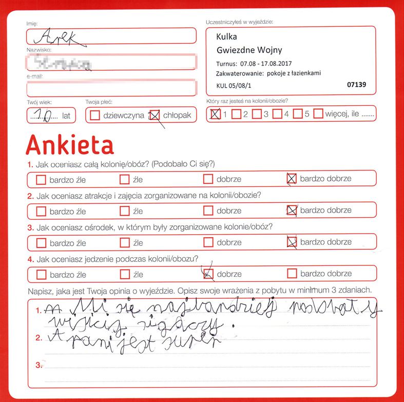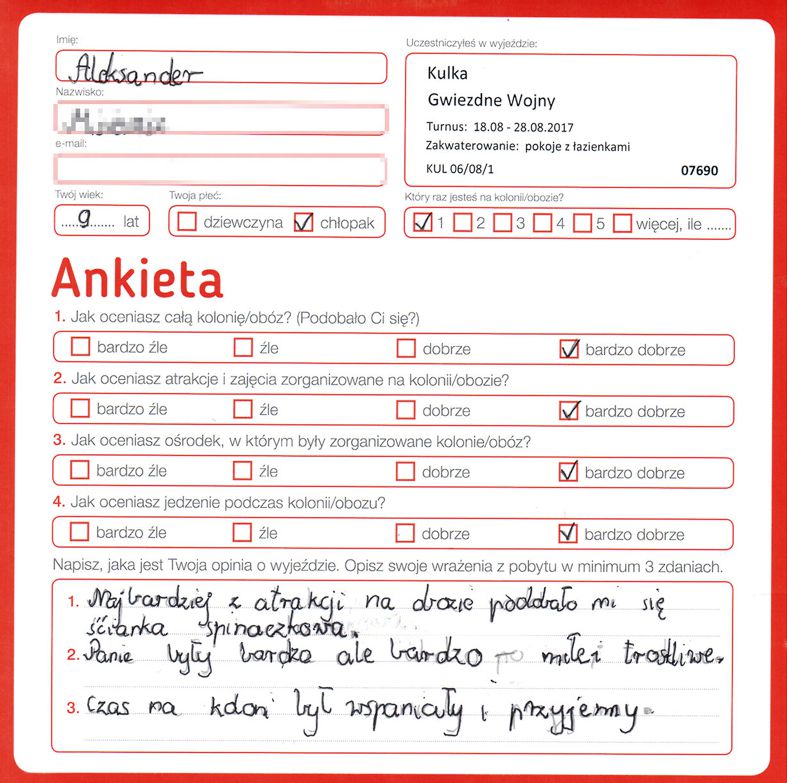 “Pani Justyna dostaje ode mnie 100+. Dziękuje panią kucharkom za smaczne jedzenie. Najbardziej podobał mi się zorbing”