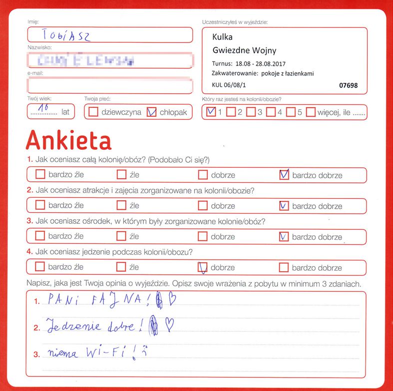 “Bardzo podobała mi się pani,która nami się opiekowała. W stołówce jedzenie było przepyszne. To były moje najfajniejsze kolonie w moim życiu”