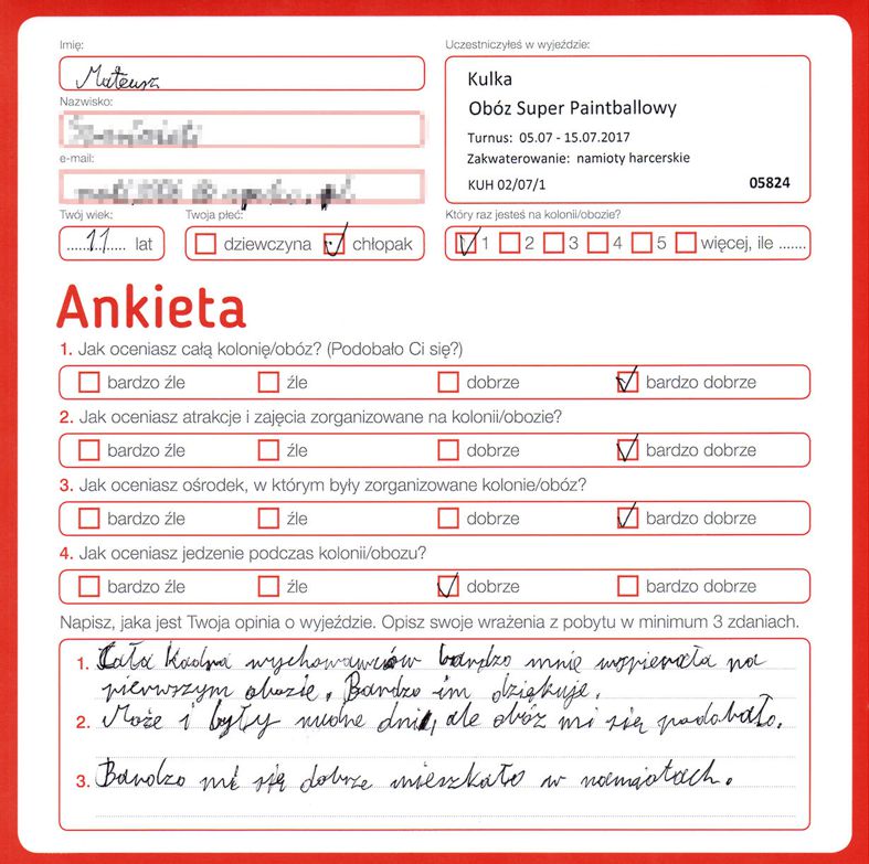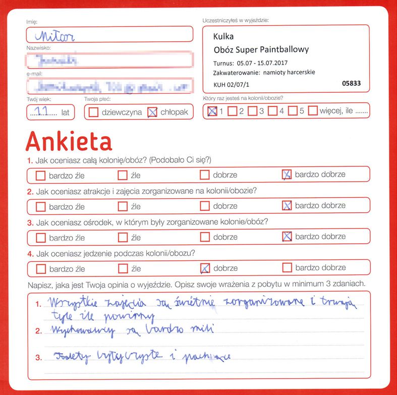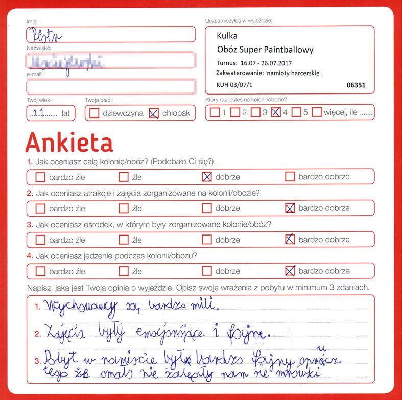 “Więcej paintball!! Za mało. Wiencej dokładek ( jedzenia) Nasza wychowawczyni była miła”