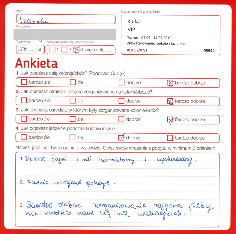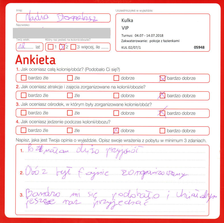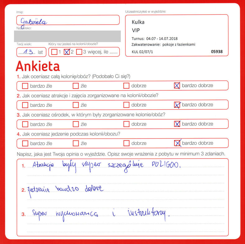 “Było bardzo fajnie. Było dużo zajęć i to mi się podobało. Pani moja była bardzo miła i inne panie i instruktorzy też. Pokój był trochę za mały dla 6 osoób ale może być.”
