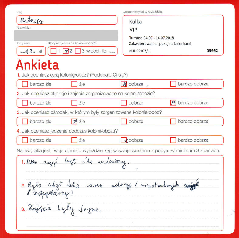 “Uważam, że jedzenie na kolonii było smaczne. Zakwaterowanie było dobre. Wyjazd był dobrze zorganizowany.”