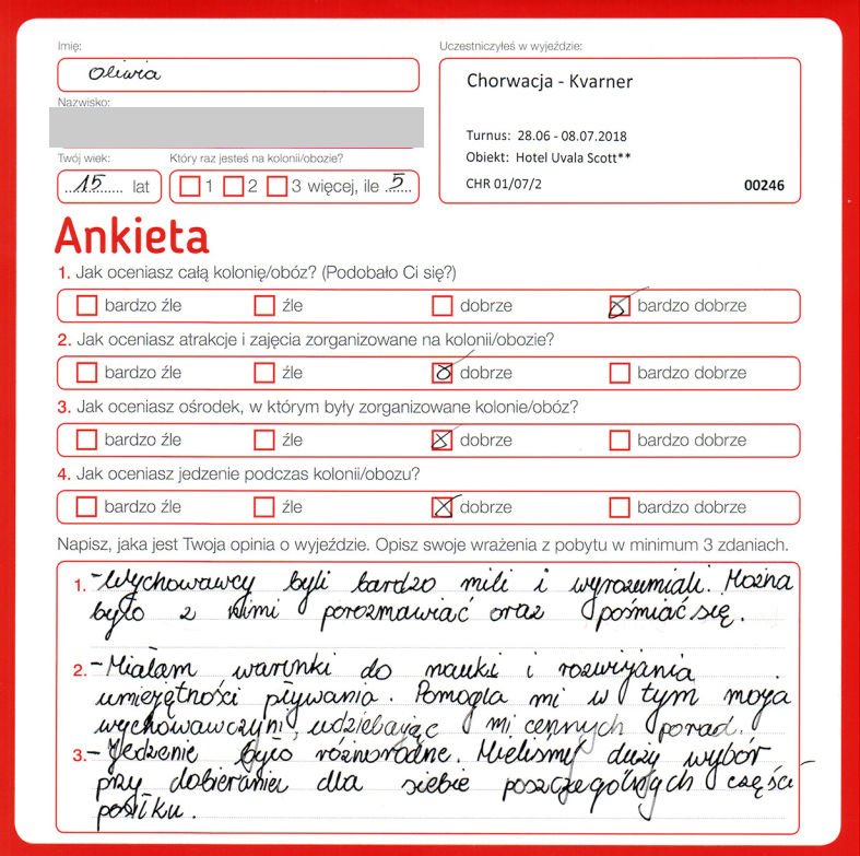 “Zawiodły mnie warunki w pokojach hotelowych, które rzeczywiście mogły być lepsze, lecz zrekompensowały mi je pyszne kolacje oraz prześliczna lazurowa woda, zdobiąca plażę ośrodka. Kąpiele pod okiem pani Danusi były niesamowitym przeżyciem, dawały one ulgę od prażącego słońca i dostarczały uczestnikom rozrywki. Jestem bardzo zadowolona z kontaktu między kolonistami a wychowawcami, którzy zawsze wysłuchiwali naszych próśb i brali je pod uwagę.”