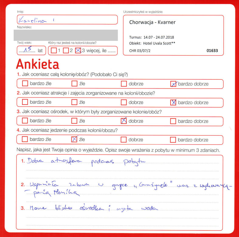 “Towarzystwo jest miłe, zabawne i można sobie pożartować prawie ze wszystkiego. Wychowawcy są mili, zapewniają nam rozrywkę i można z nimi normalnie porozmawiać. Organizacja wycieczek jest dobra. Najlepsze Jeziora Plitwickie. Jedzenie i zakwaterowanie są złe. Jedzenie niedoprawione (smakuje jak jakaś podeszwa). W pokojach są robaki, w niektórych pokojach były skolopendry.”