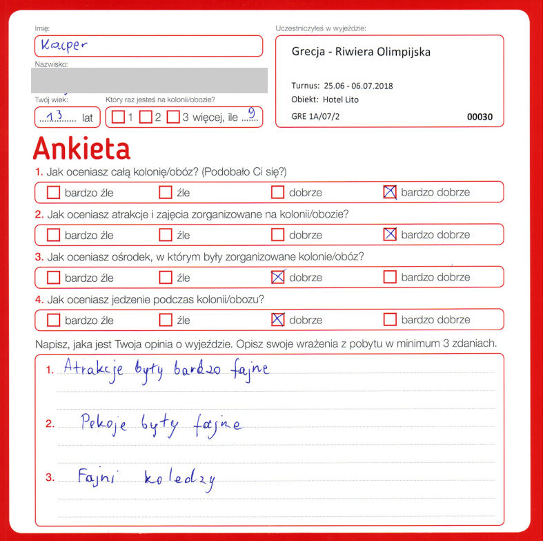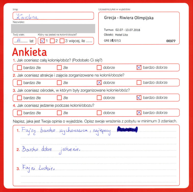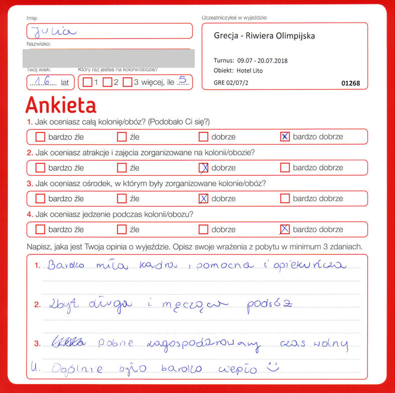 “Wyjazd podobał mi się bardzo, ponieważ miałam fantastyczną wychowawczynię. Inni koloniści byli w porządku. Klimatyzacja w moim pokoju bya wadliwa.”