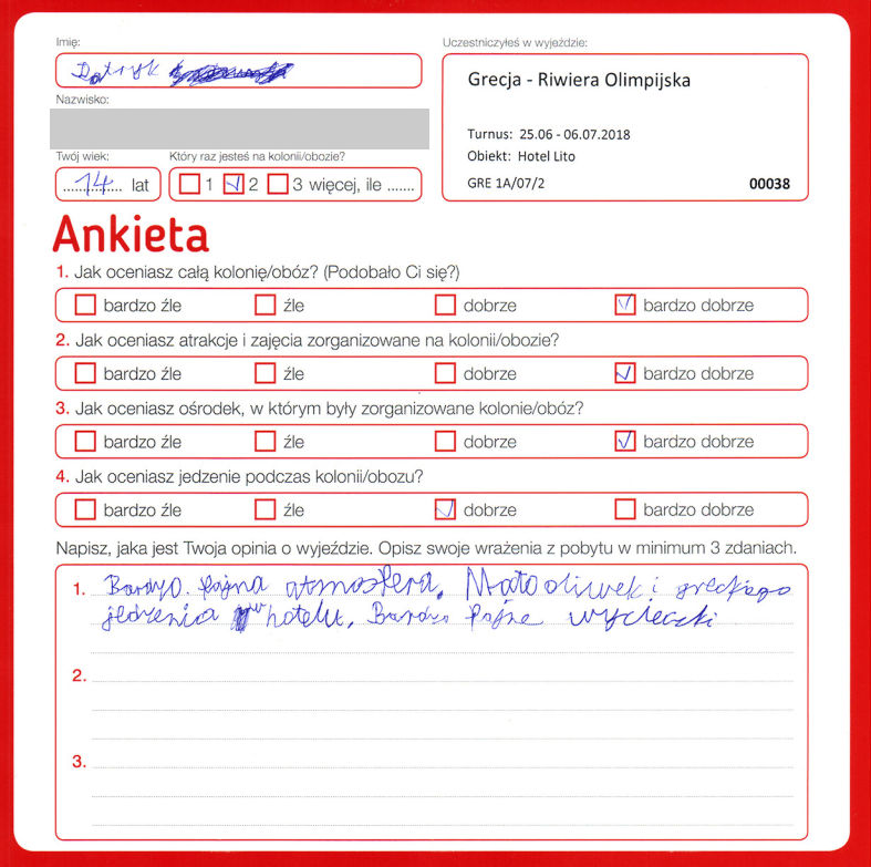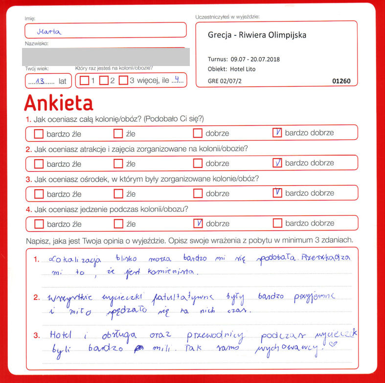“Na kolonii bardzo mi się podobała. Panowała miła atmosfera zarówno z rówieśnikami jak i z wychowawcami. Wycieczki fakultatywne były bardzo atrakcyjne. Najbardziej podobał mi się rejs na wyspę skiathos. Myślę , że ta wycieczka powinna być w programie. Osrodek, w którym bylismy, był bardzo dobrze wyposażony. Zabrakło jedynie pobliskiego sklepu.”