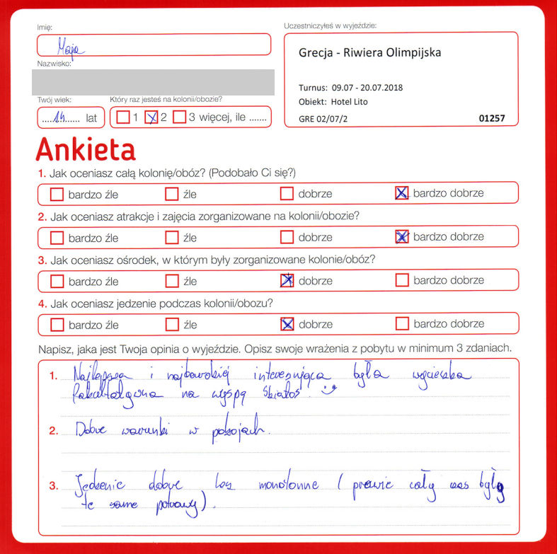 “Na tym obozie bardzo podobał mi się rejs statkiem na wyspę Skiathos i wycieczka na Meteoryty. Jedzenie w tym osrodku było monotonne- chciałbym aby menu było bardziej zróżnicowane Ogólnie obóz mi się bardzo podobał, lecz zmieniłabym zakwaterowanie do innego hotelu, ponieważ na plazy nie dało się plazować- przez kamienie i przez monotonne jedzenie”