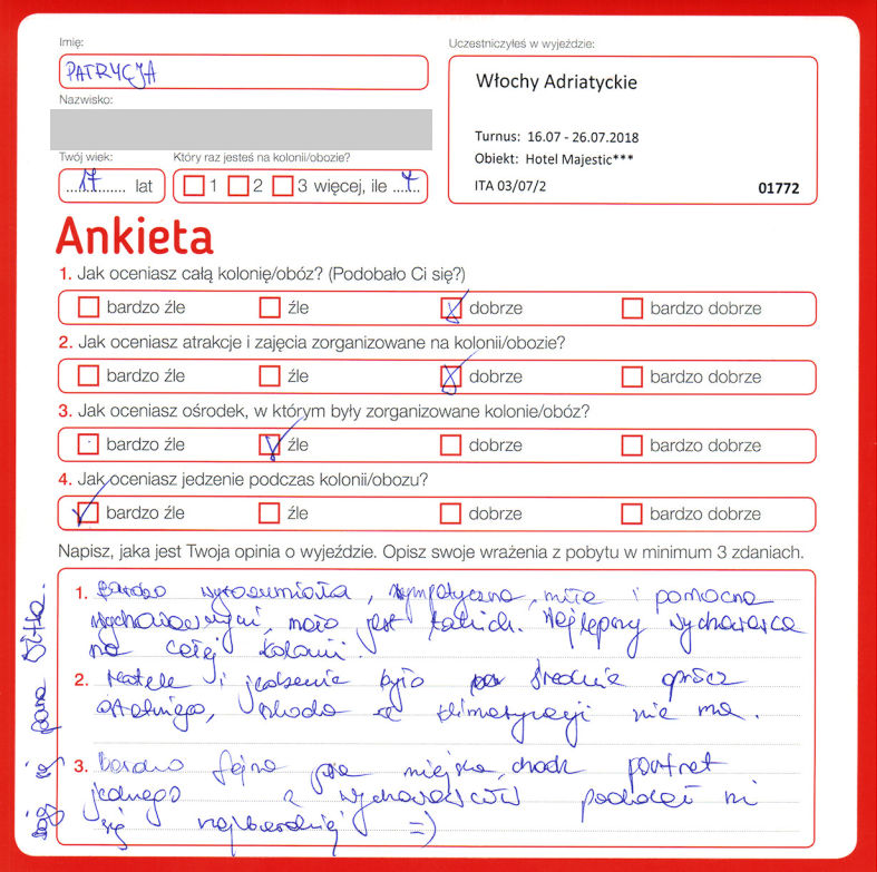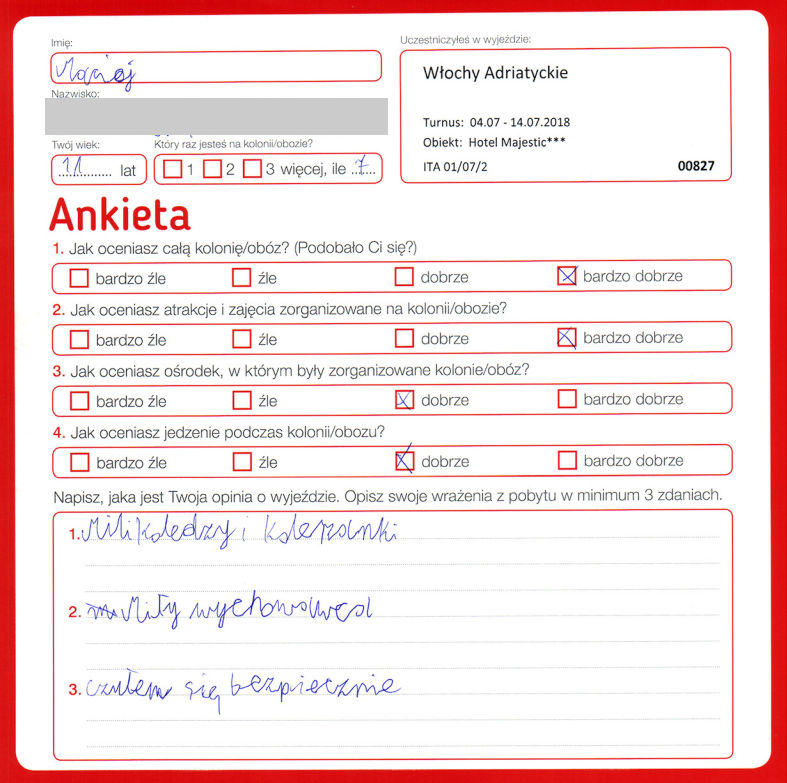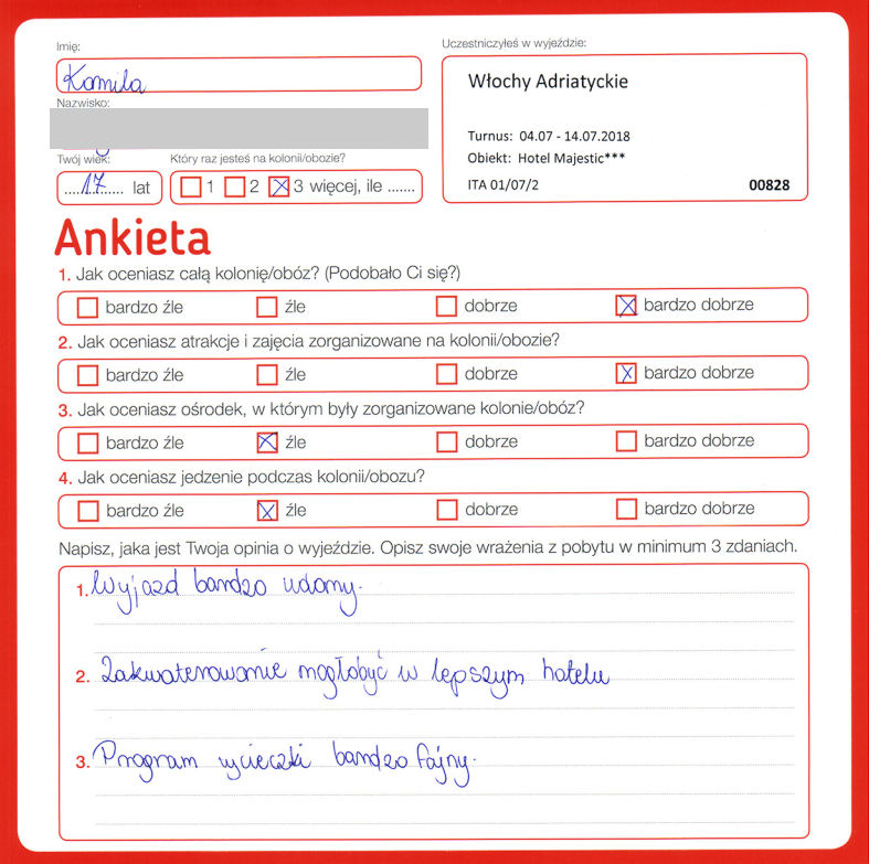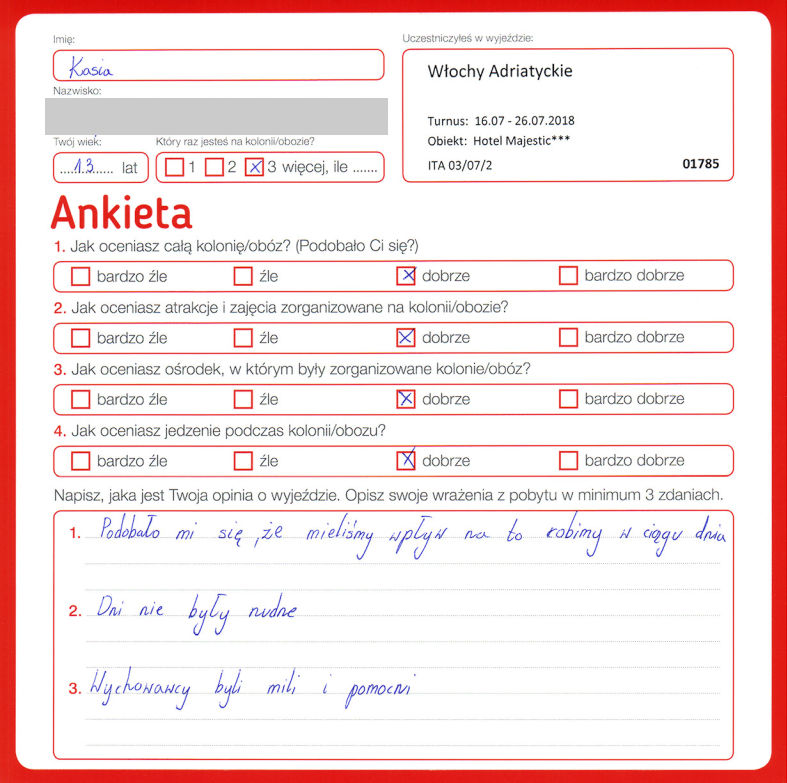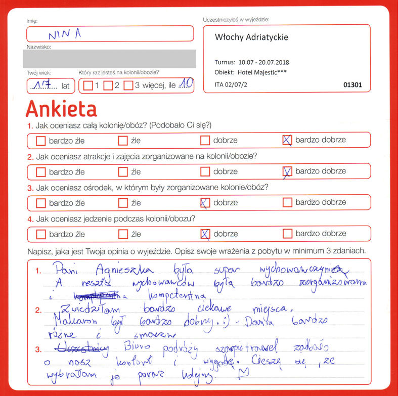“Wyjazd bardzo mi się spodobał. Drugi raz jestem na kolonii z tego biura i uważam, że bardzo się stara spełnić oczekiwania uczestników. Atrakcje, które zwiedzalismy były przemyślane i bardzo ciekawe. Wyjścia na plażę i miasto również były interesujące. Wychowawca- pani Alicja Milewska- jest bardzo miłą i uprzejmą osobą. Potrafiła zadbać o nasze bezpieczeństwo, jednocześnie podchodząc do wszystkich na luzie.”