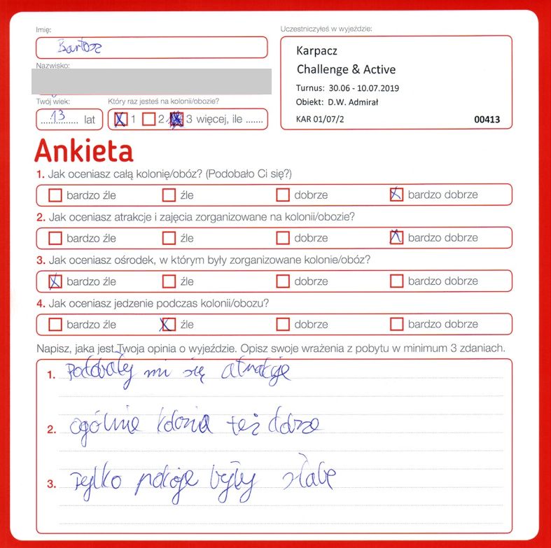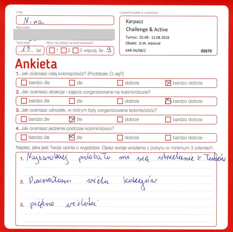 “Moje wrażenia z obozu były bardzo pozytywne, ponieważ bardzo szybko poznałem kolegów i koleżanki. Jedzenie było bardzo dobre. Instruktorzy byli bardzo bardzo fajni i zabawni.”