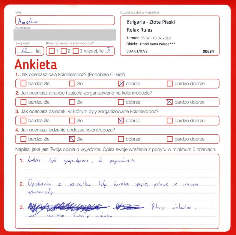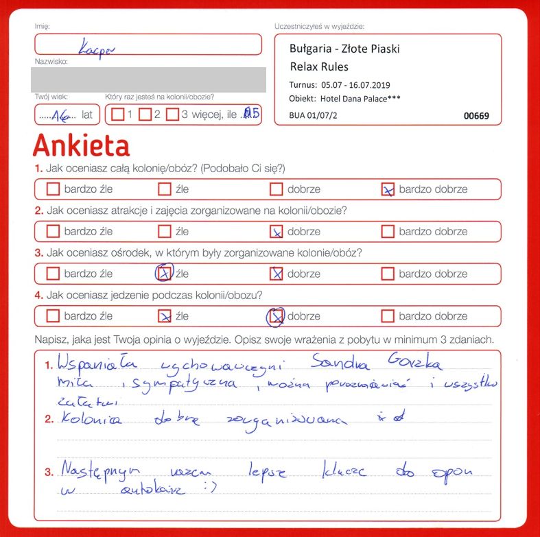 “Biorąc wszystko pod rozwagę uważam, że ten obóz bardzo był dobrym wyborem. Jest to moja pierwsza kolonia i nie wiem kiedy zleciały mi te 15 dni (fajne wychowawczynie). Bardzo fajnych poznałem ludzi, chętnie bym tu wrócił, lecz już po 18 latach skończonych nie mogę. Ps. pozdrowienia dla p. Eweliny.”