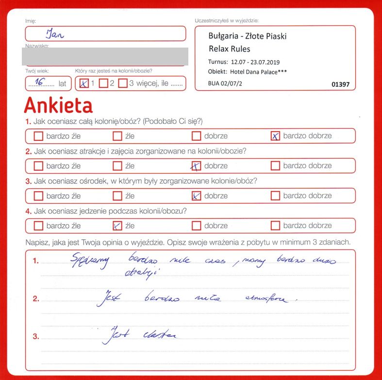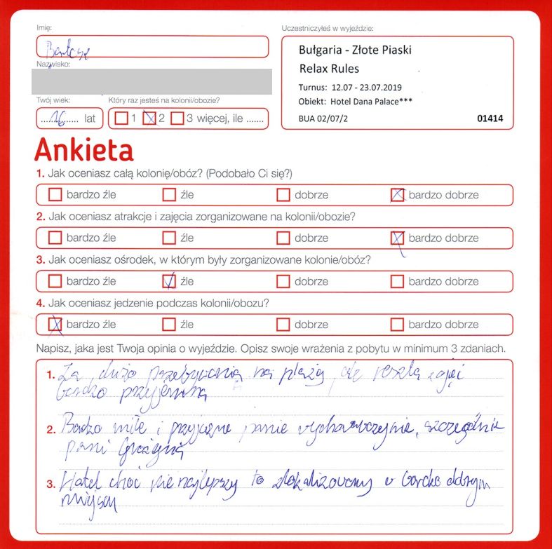 “Dzięki naszej wychowawczyni ten obóz była cudowny. Reszta wychowawczyń nie do końca umiała pracować oraz dogadać się z młodzieżą. Warunki hotelowe średnie, jedzenie niedobre, gdyby nie Pani Grażynka obóz byłby najgorszym na jakim kiedykolwiek byłem.”