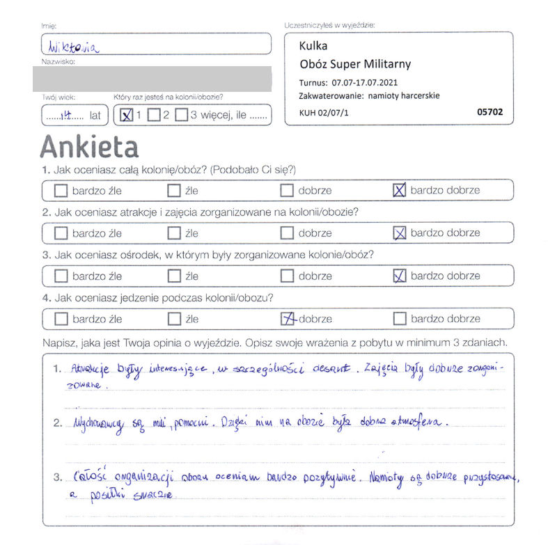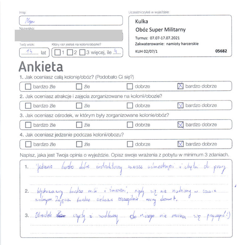 “Bardzo mi się podobało. Namioty harcerskie były dobrze wyposażone. Łóżka były wygodne. Instruktorzy i wychowawcy byli bardzo mili i pomocni. Zajęcia były ciekawe i dobrze zorganizowane.”