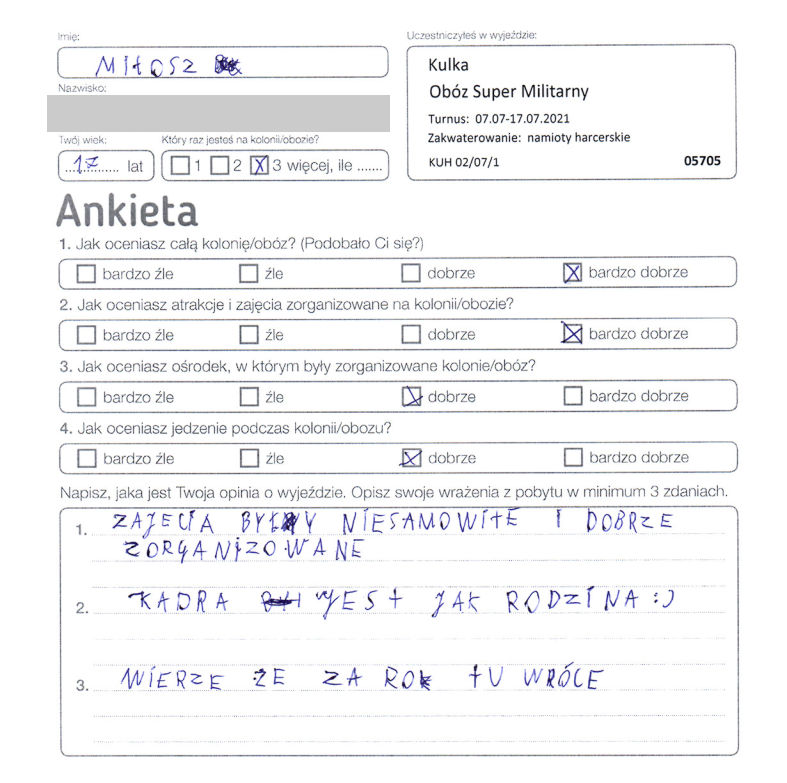 “Bardzo miła atmosfera, super grupa oraz wychowawca. Bardzo podobał mi się nocny desant, widać było, że wychowawcy/instruktorzy byli zaangażowani. Cieszę się, że dostaliśmy nieśmiertelniki oraz kurteczki.”