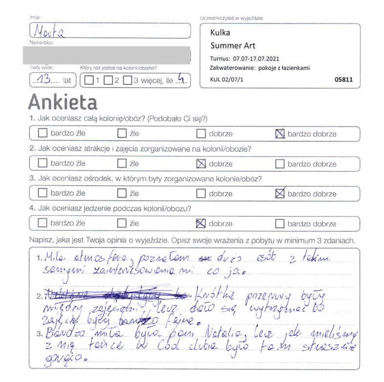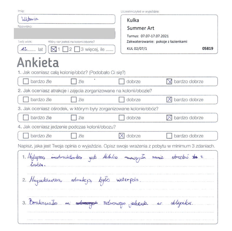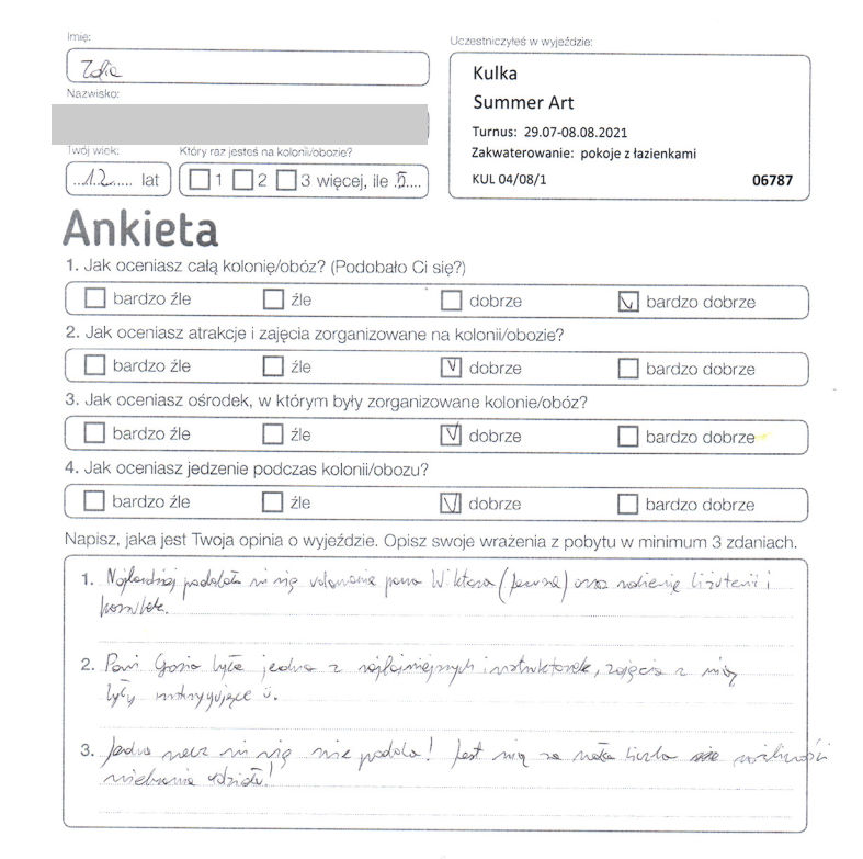 “Wyjazd był ogółem fajny, w pawilonie (przynajmniej w 3) światła włączały się automatycznie niczym w statku kosmicznym, a w pokoju zastałam porządek, jednak gniazdka mogłyby być w bardziej dostępnych miejscach dla wszystkich. Obiady były pyszne, chociaż mogłyby być też pierogi. Na ośrodku jest dużo miejsca i zawsze jest wolna ławka. To że na obozie nie ma zbyt dobrego internetu nie jest najgorsze, jednak zasięg mógłby być też w pokojach żeby nie trzeba było wychodzić na dwór żeby porozmawiać z rodzicami. Wychowawczyni była przemiła i rzadko na kogoś krzyczy. Obóz Kulka wspominam i będę bardzo dobrze (jeden z lepszych obozów). Pozdrawiam.”