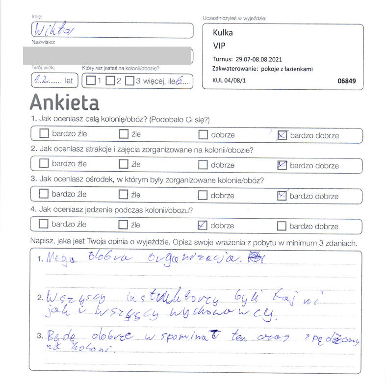 “Podobało mi się bardzo rozmieszczenie wszystkich budynków, atrakcji i innych. Jedynie co mi się nie podobało w rozmieszczeniu to poligon, który był bardzo daleko. Ten obóz podobał mi się bardziej od poprzedniego, ponieważ było wtedy mniej atrakcji przez koronawirusa, była mniej miła opiekunka i też mieszkaliśmy w namiotach, a była ulewa. Były świetne atrakcje ale wydaje mi się, że niektóre były gorsze ale i tak fajne. Powinny być lepsze obiady np. lepszy ryż, na kolację więcej dodatków jak np. na śniadanie, czyli płatki i naleśniki.”