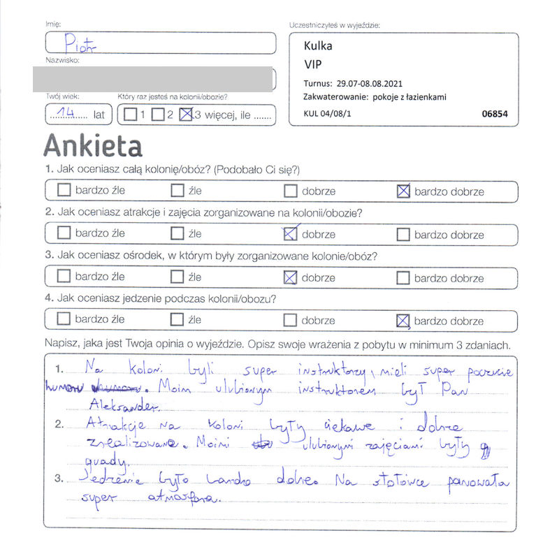 “Bardzo polecam ten rodzaj kolonii, czyli "VIP", ponieważ w programie znajduje się mnóstwo różnych atrakcji. Jedyny minus na Kulce to wysokie ceny w sklepiku i brak guzików na poszewce od kołdry lub poduszki. Najlepszy instruktor to pan Olek tzw. cukiereczek.”