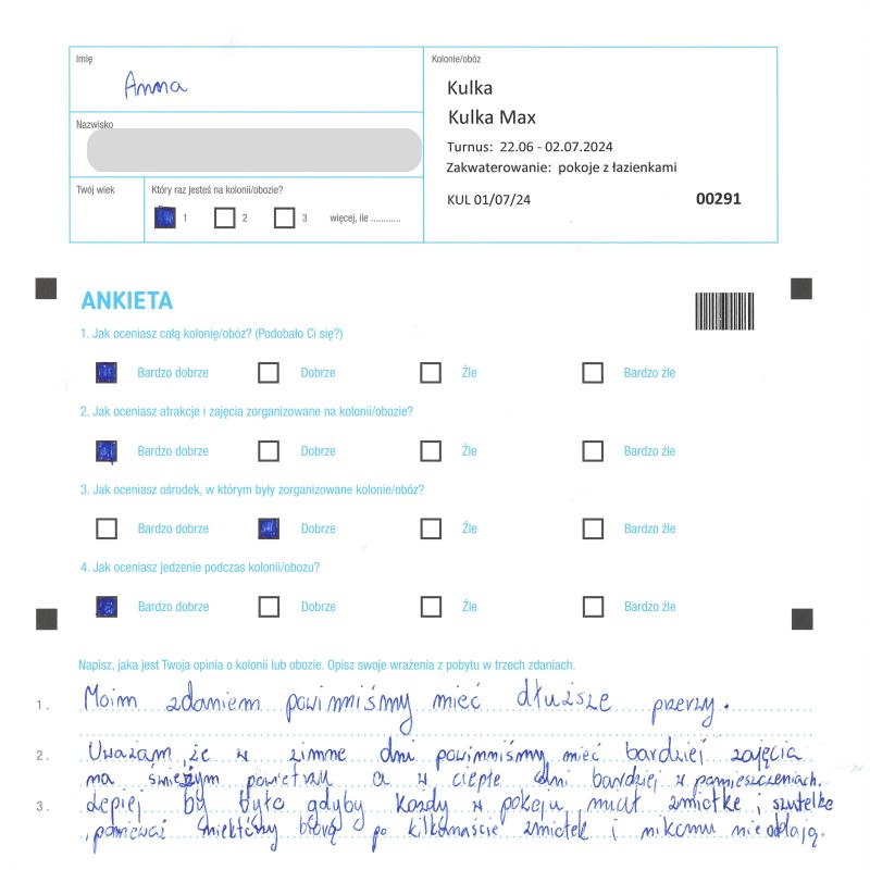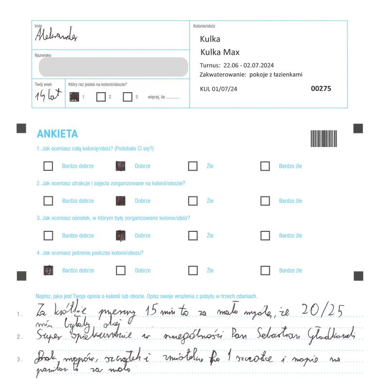 “Bardzo mi się podobało. Fajne zajęcia i instruktorzy jeszcze lepsi i pani wychowawczyni. Smaczne jedzenie.”