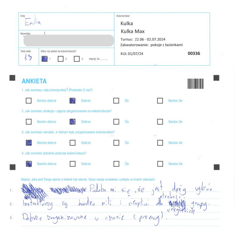 “Wychowawczyni mojej grupy była bardzo kochana. Spędzała z nami pozytywnie czas i umiała wszystkie zajęcia. Zakwaterowanie w pawilonie było super. Jedzenie na stołówce było smaczne. Instruktorzy z naszych zajęć byli profesjonalni a zarównież fajni, zajęcia z nimi były przyjemne. Moja grupa była zgrana i się dogaduje, zajęcia z nimi były fajne, ciekawe. Obóz oceniam bardzo pozotywny i planuję wrócić tutaj.”